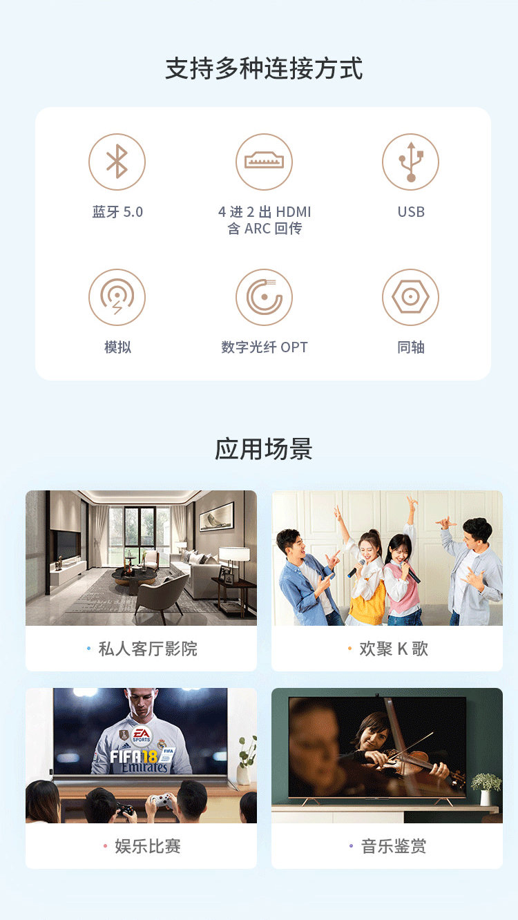 腔体采取涡轮式排列,对地增压,释放强大震撼感。功放主机具有视频四路高清4K HDMI输入和2路HDMI输出,其中包含ARC回传功能。数字COX、OPT输入、模拟AUX、5.0蓝牙播放功能。随机自带4种出场模式